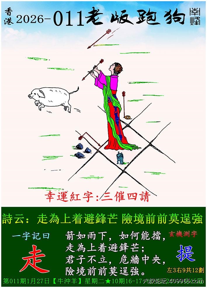 011期老版跑狗一字記之曰:【走】 詩雲:走為上着避鋒芒,險境前前莫逞強。