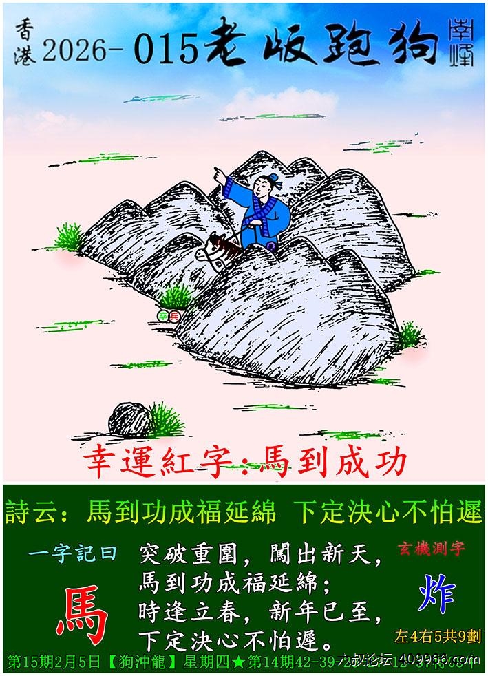 015期老版跑狗一字記之曰:【馬】 詩雲:馬到成功福延綿,下定決心不怕遲。
