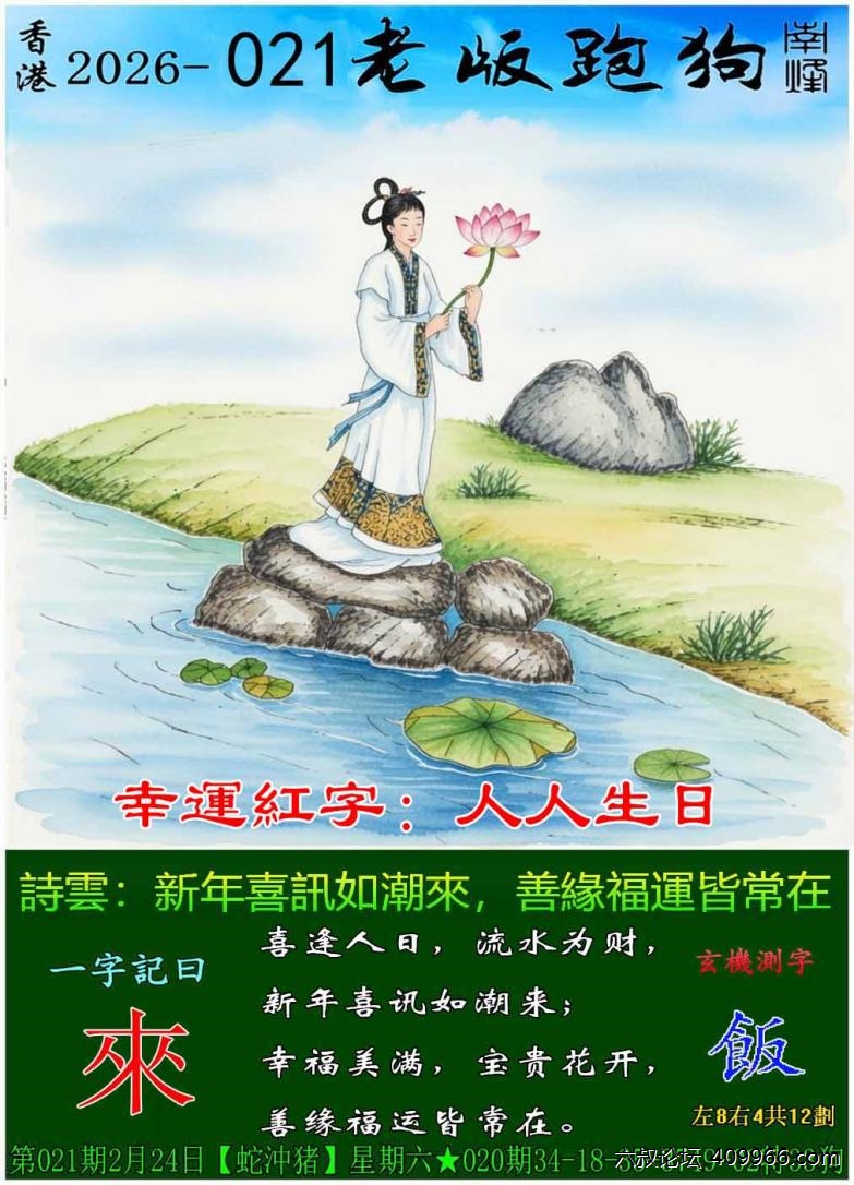 021期老版跑狗一字記之曰:【來】 詩雲:新年喜訊如潮來,善緣福運皆常在