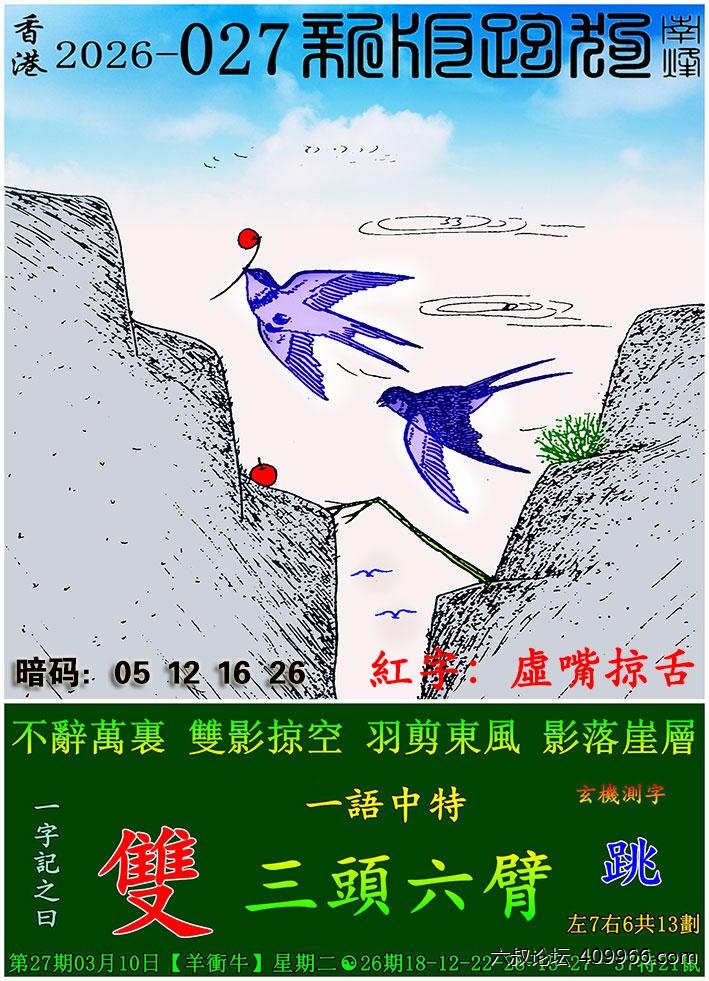 027期新版跑狗一字記之曰:【雙】 玄機測字:《跳》 一語中特:三头六臂
