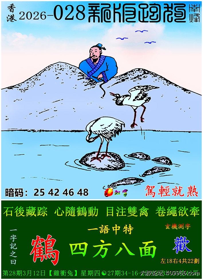 028期新版跑狗一字記之曰:【鶴】 玄機測字:《歡》 一語中特:四方八面